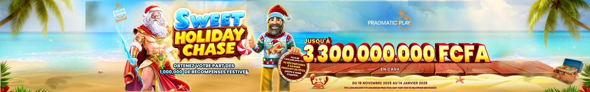 • Les Sweet Holiday Chase Weekly Prize Drops ont lieu chaque semaine du 19 novembre 2025 à 19h01 CET au 14 janvier 2026 à 18h59 CET (la « période promotionnelle »). Il s'agit d'une promotion réseau gérée par Pragmatic Play et les cagnottes sont partagées entre différents opérateurs.